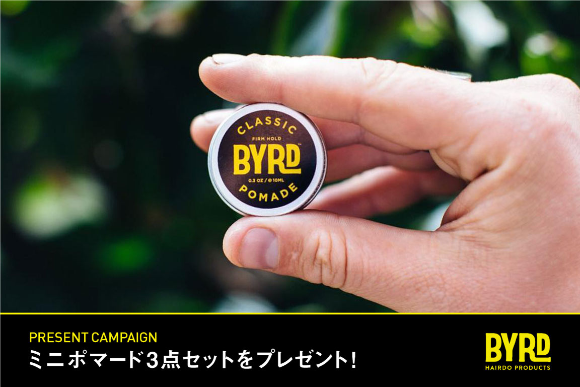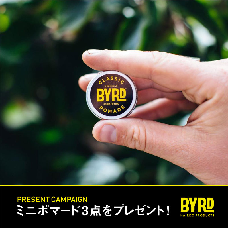 只今、BYRDポマードを3個以上お買い上げの方に、旅行や携帯に便利なミニポマードカクテルキットを先着20名様にプレゼント!夏気分を盛り上げる、BYRDポマード4種をCheck!