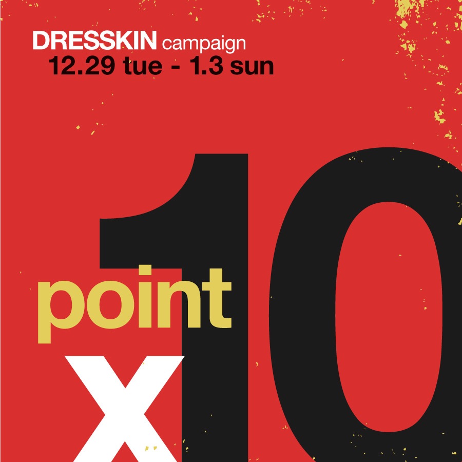 いつもDRESSKINをご愛顧いただき、誠にありがとうございます。今年一年の感謝と、新年が皆様にとって素敵な一年になることを願い、年末年始限定の全商品対象ポイント10倍キャンペーンを開催いたします。 利用額に応じて通常1%(100円で1ポイント)のところ、開催期間中でのご購入に限り10%(100円で10ポイント)を付与いたします。このお得な期間にぜひお買い求めください!