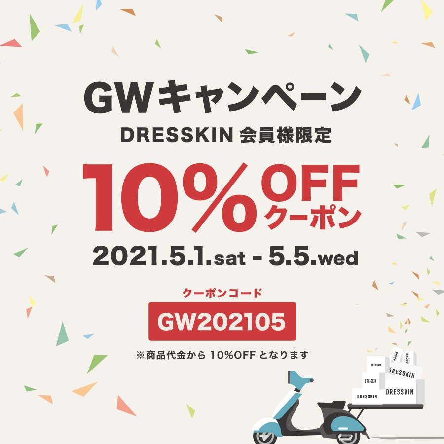 5/1〜5/5の期間、「DRESSKIN 10%OFF クーポンプレゼント」キャンペーンを開催します。
